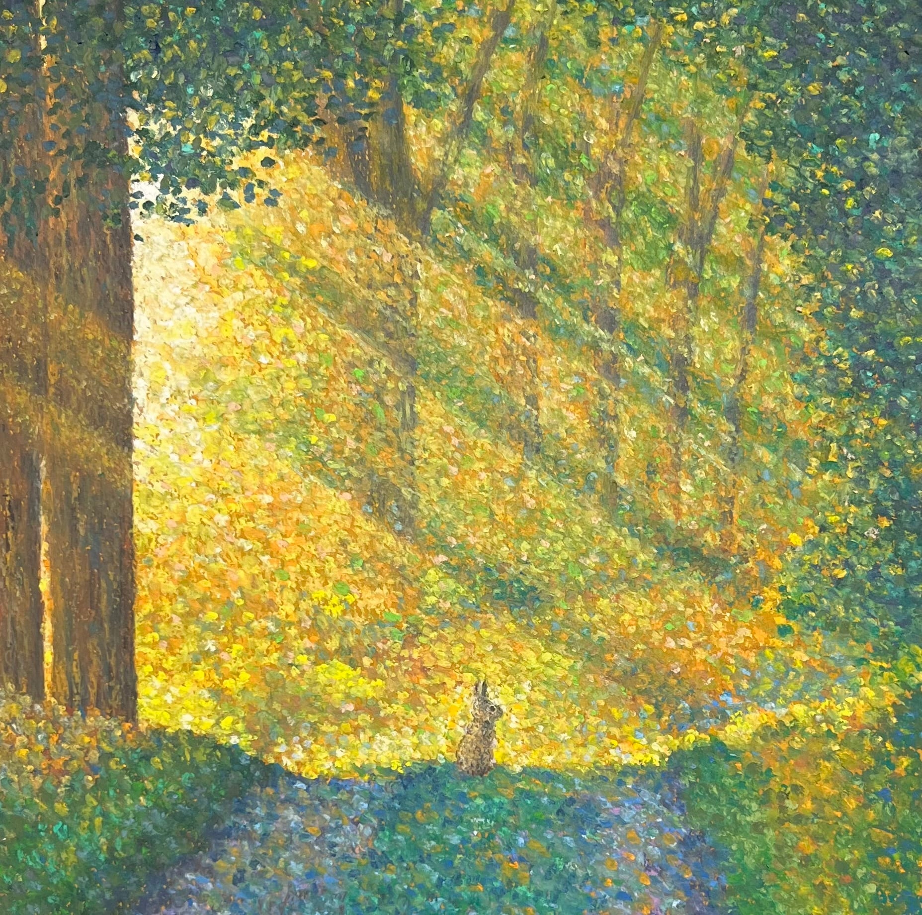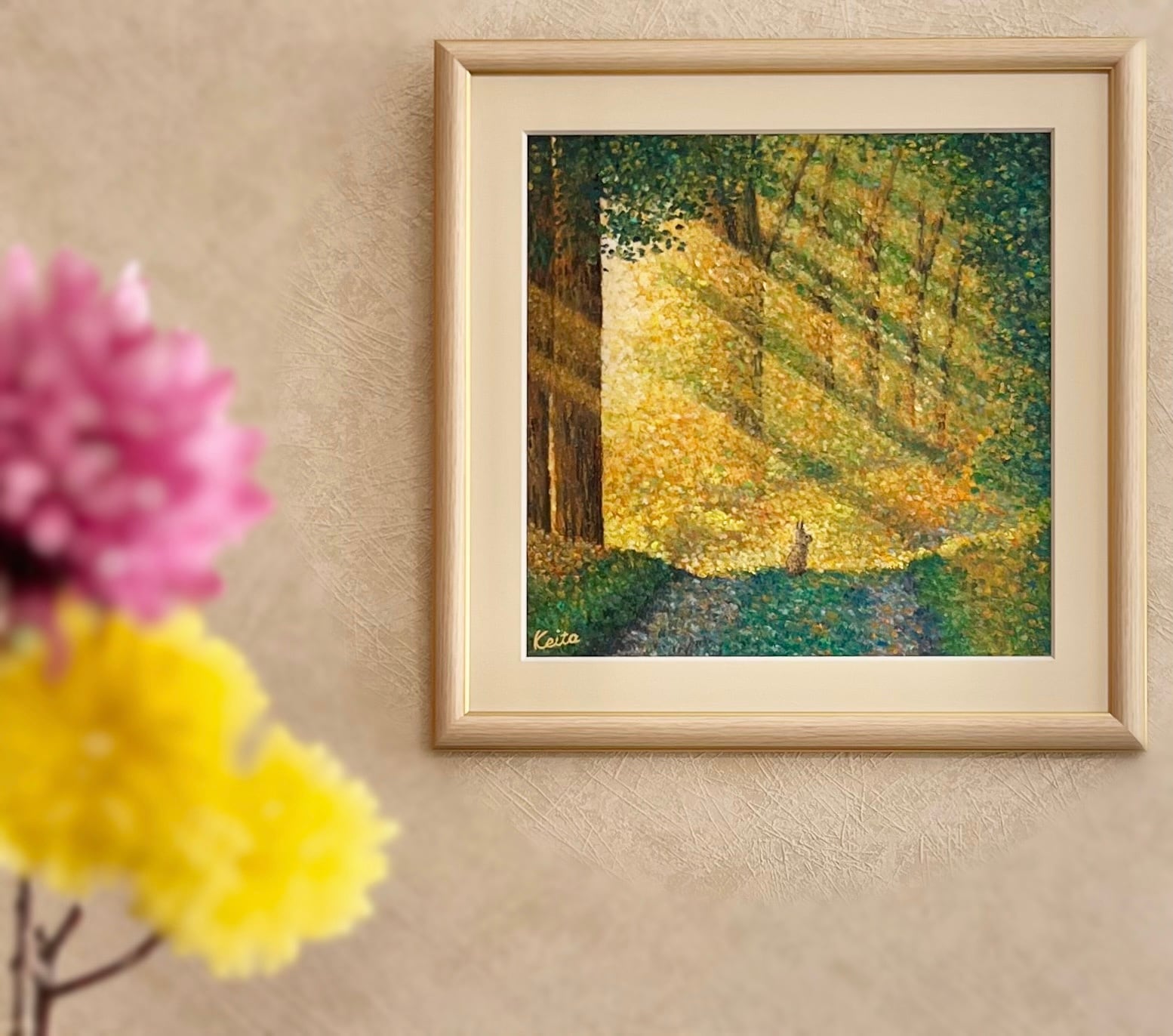 木漏れ日を描くのが好きで、以前からその表現を追求してきました。目指したのは、光と影のコントラストや光の先に朧げに映る景色を点描で表現することです。現実を超える色彩のイメージです。